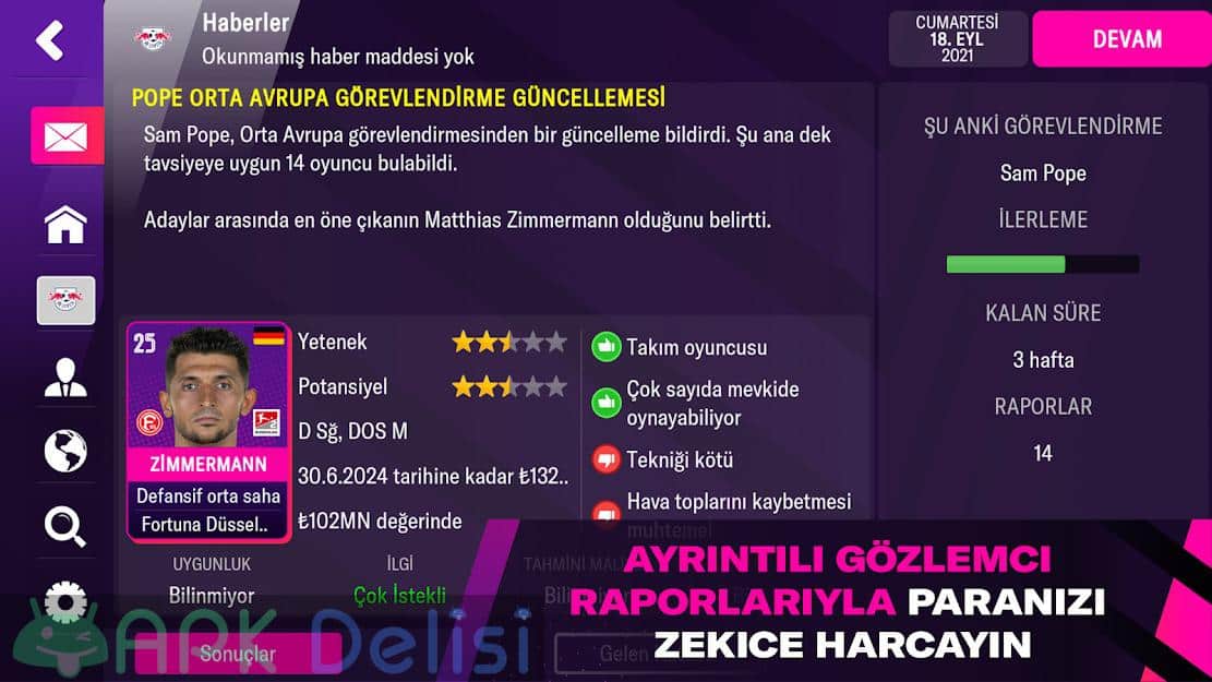 Football Manager 2022 Mobile MOD APK v13.3.0 LATEST VERSION هي إحدى ألعاب كرة القدم الشهيرة في عالم android، من إنتاج SEGA، والمعروضة للبيع مقابل 109.99 ليرة تركية على متجر Play، والتي أوصي بها لأولئك الذين يحبون الألعاب مثل إدارة فريق كرة القدم وإدارته. هدفك الرئيسي في اللعبة هو القتال ضد الفرق المتنافسة، وتسجيل الأهداف ومحاولة الفوز بالمباريات مع الفريق الذي تديره. نظرًا للمشاكل العامة التي واجهت التطبيق مع Football Manager 2022 Mobile APK v13.3.0 أحدث إصدار، أقدمه لكم، مستخدمينا الكرام، في شكل LATEST VERSION FULL APK، حتى تتمكن من الحصول على اللعبة دون دفع أي رسوم ولعب العديد من الفرق، بما في ذلك الدوري التركي. الآلاف من البلدان والفرق واللاعبين الموهوبين والمهارات التكتيكية والإدارة وغيرها الكثير في انتظاركم، أيها مستخدمي ألعاب Android القيمين. وجدت في اللعبة دعم اللغة التركية وسوف تساعدك على فهم كل شيء بسهولة. أتمنى لكم ألعاب ممتعة مقدما. أتمنى لكم ألعاب ممتعة مقدما.