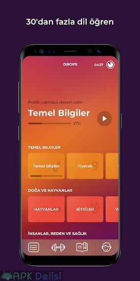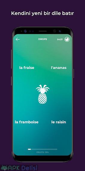 Drops: Language Learning, ao contrário de outros aplicativos de aprendizagem de idiomas, o Drops permite que você aprenda palavras com as opções visuais 0. Aprender palavras visualmente tem mais a ver com compreensão do que com memorização. Se você deseja aprender com facilidade e rapidez, recomendo este aplicativo aos usuários. Você pode aprender facilmente a pronúncia das palavras e pronunciá-las em voz alta. Outra funcionalidade deste aplicativo que vai te viciar mais do que as imagens é aprender palavras com jogos. Graças aos jogos, isso ficará facilmente na sua mente e você verá a melhora do seu vocabulário depois de um determinado dia.